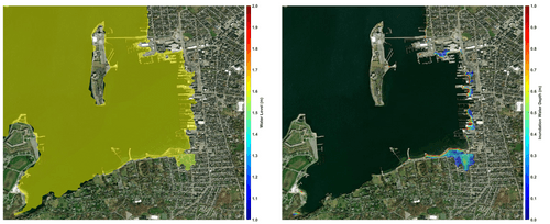 Figure 2: ADCIRC predicted maximum water level (left) and corresponding inundation depths over land (right) from a simulation of Hurricane Sandy.